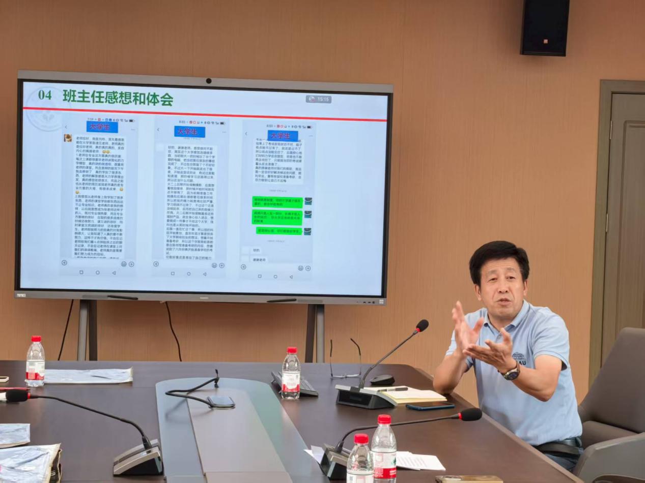 在交流环节,学校“十佳班主任”张玉成老师以“如何做好大学班主任——做大学生全面发展的引路人”为题进行分享。他分析了当前大学生的特点,就班主任如何从德、智、体、美、劳五个方面助力学生全面发展提出相关建议和分享细节性经验。