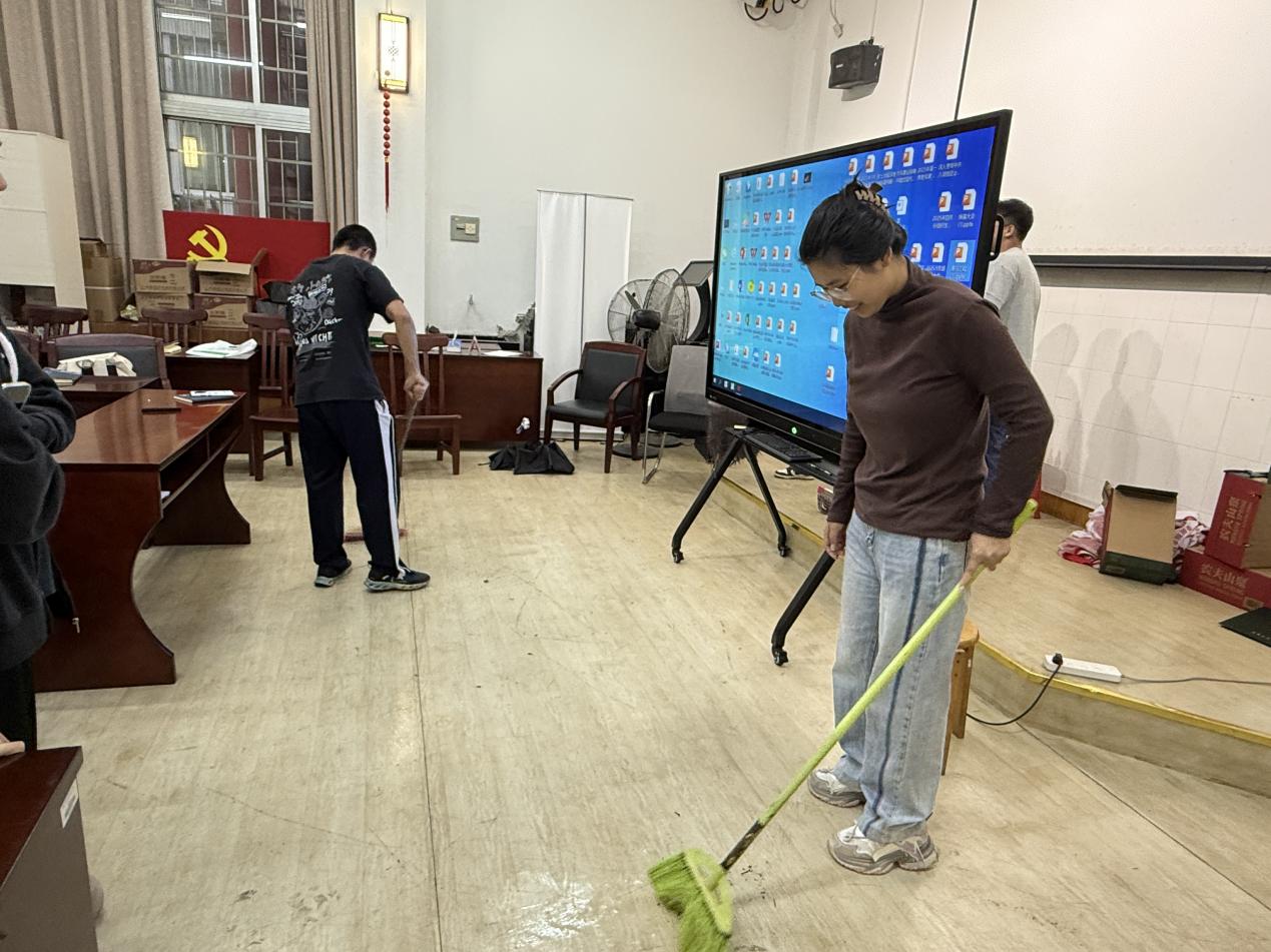 活动期间,同学们手持扫帚、抹布等工具,对活动室地面及桌椅进行细致清扫,同时整理书架上的书籍资料、擦拭门窗玻璃。经过近两小时的协作,党员活动室焕然一新。