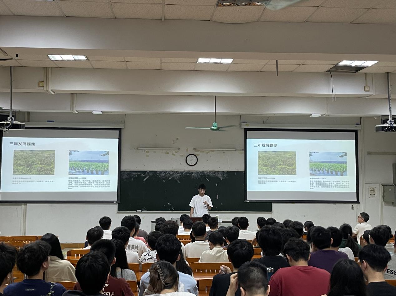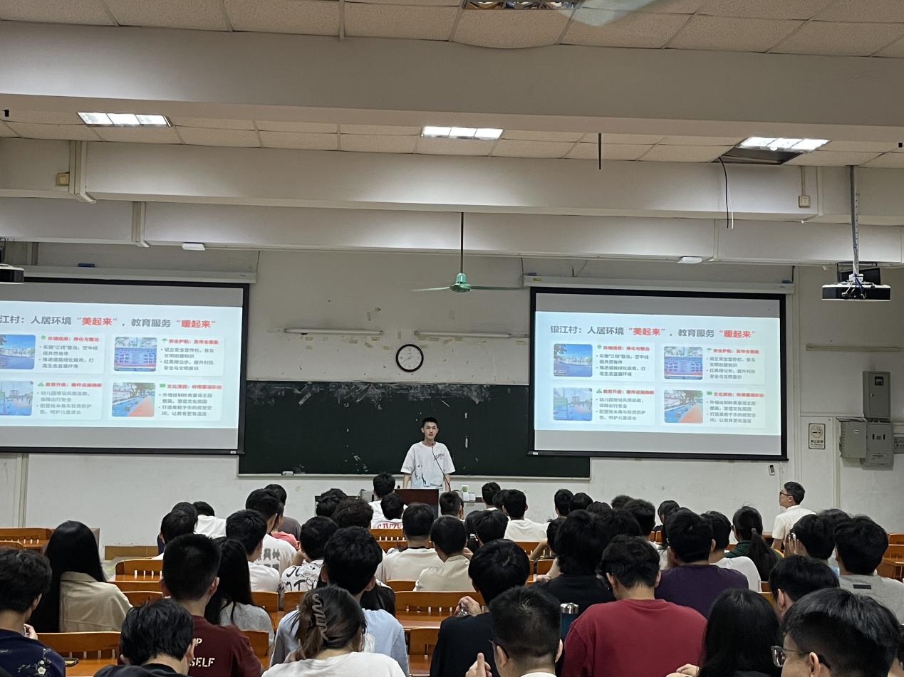 来自土木工程专业的胡睿同学以“大地根扎,向上生长”为题,讲述了他参加专项调研,与来自清华大学、中国人民大学、中国矿业大学、武汉大学的学生一起前往清远连南开展调研、撰写报告、手绘墙画、设计文创和制作宣传视频的故事;连续三年参加“万名学子乡村大调研行动”的邓子山同学用丰富的照片生动记录“百千万工程”在南粤大地从落地生根到繁花满枝的实践历程,呈现了“三年初见成效”背后的实干实绩;建筑学专业李金志同学以自己家乡茂名化州为例,生动讲述了“百千万工程”如何让一个村庄的党群服务中心、学校校舍和撂荒农田发生根本性转变,为“三年初见成效”写下了最直观的注脚。